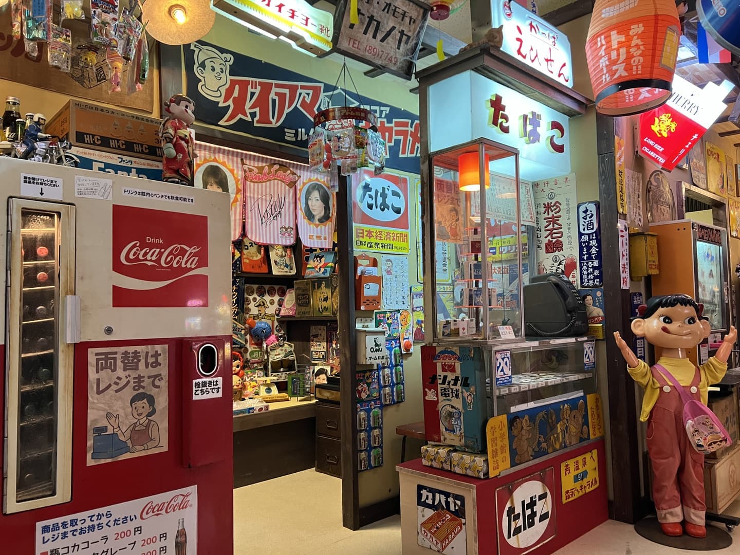 昭和の駄菓子屋さんでは当時の駄玩具や、お菓子の箱などが展示されています。入り口のコカ・コーラ販売機では瓶コーラや瓶ファンタなどを実際に販売しています(お支払いはレジまで)当時の電飾看板や琺瑯看板などをお楽しみ下さい。