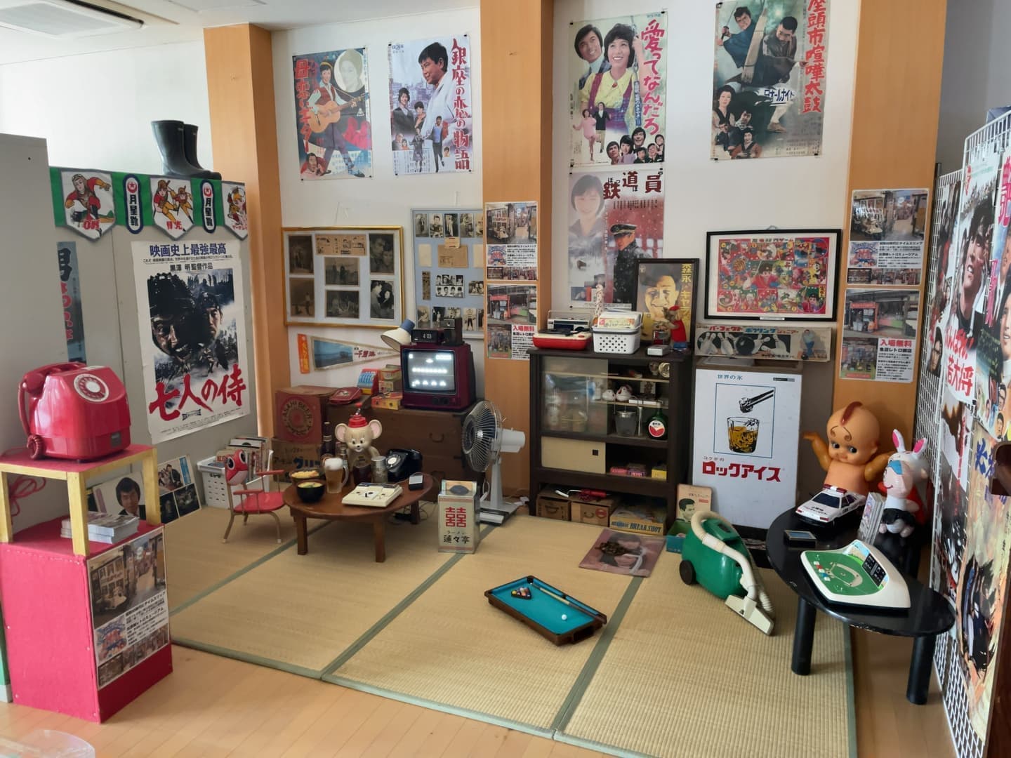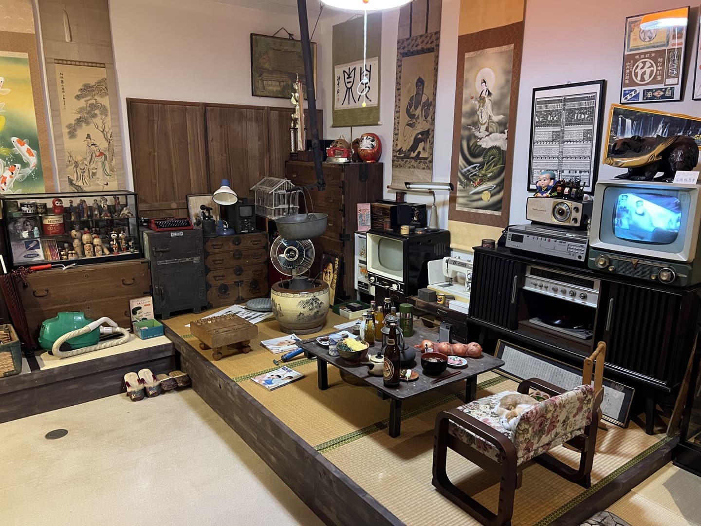 1950年から1960年当時の居間を再現。まるで田舎のおじいちゃんの家に来たような感覚?当時のテレビやラジオ、レコードプレーヤーは現役で動作していますよ。畳に上がって記念撮影もOKです。