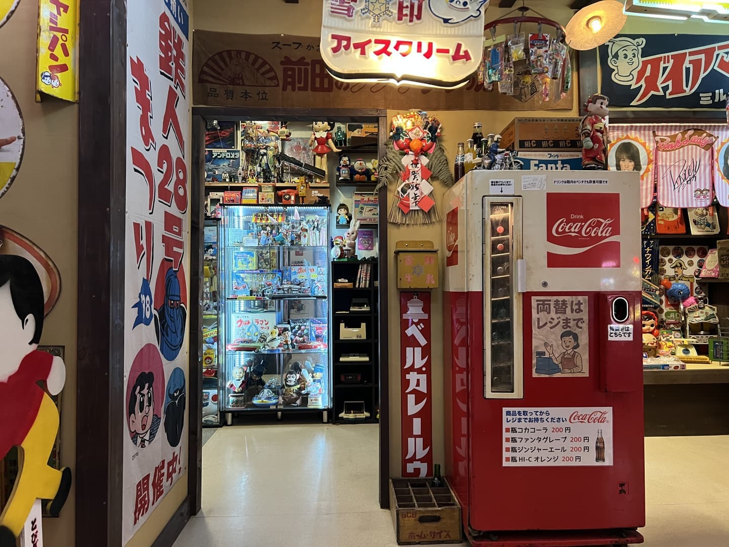 昭和の駄菓子屋さんでは当時の駄玩具や、お菓子の箱などが展示されています。入り口のコカ・コーラ販売機では瓶コーラや瓶ファンタなどを実際に販売しています(お支払いはレジまで)当時の電飾看板や琺瑯看板などをお楽しみ下さい。