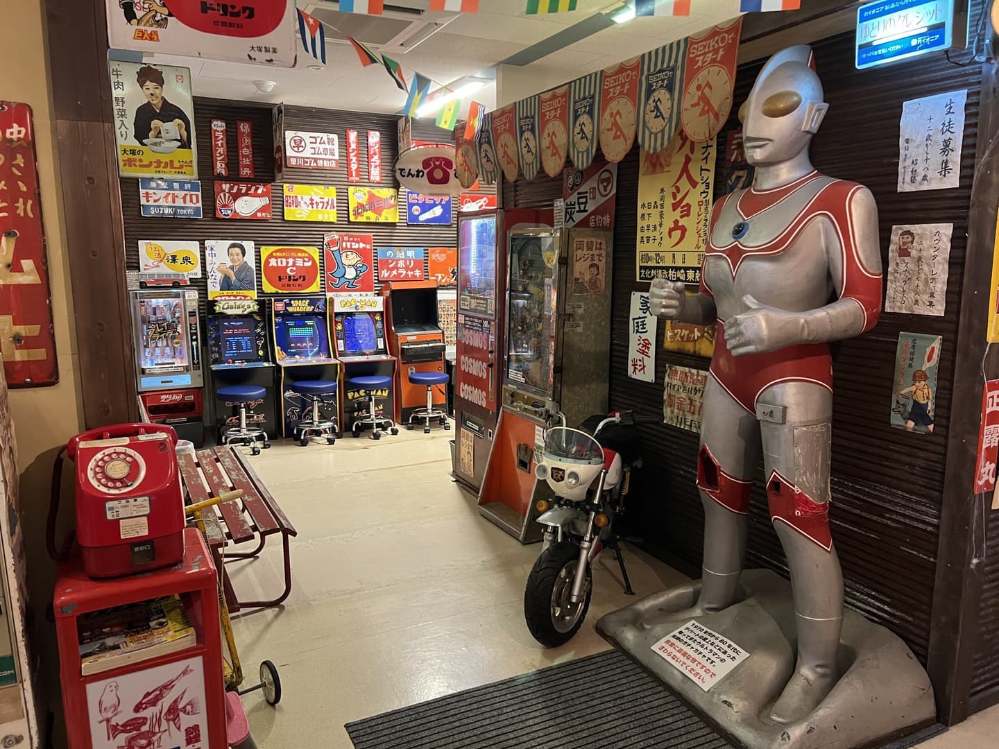 昭和レトロ休憩コーナーにはベンチが用意してあります。当館で購入した瓶コーラやハンバーガー、駄菓子の飲食などにご利用ください。(ゴミは入口のゴミ箱へ)巨大な帰ってきたウルトラマンや赤電話との記念撮影も!バシャ!