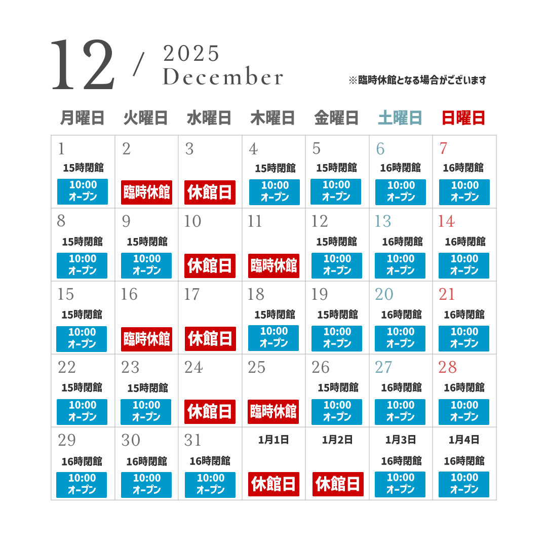 | 2025/11/20 | 11月20日から12月末までの期間限定で 一般(中学生以上)1,000円→800円 障がい者(中学生以上)800円→600円 団体(15名以上)800円→600円 |